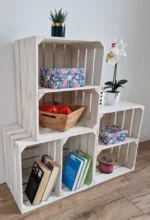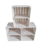 • Wooden crates with a single shelf – available in white and white with a burned-wood effect, combining simplicity with vintage charm.