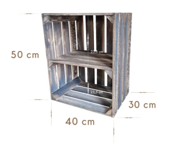 Funkcjonalne regały zbudowane z drewnianych skrzynek.