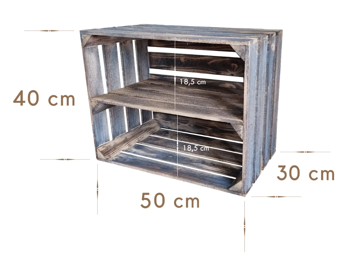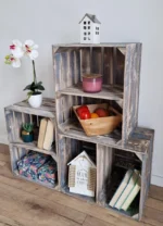 Funkcjonalne regały zbudowane z drewnianych skrzynek.